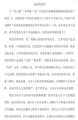 青春本该纯粹自由,不该被“校园贷”的阴霾笼罩。为增强同学们的金融安全意识,筑牢防范校园贷的思想防线,引导大家树立健康消费观,现特举办“远离校园贷,青春不负债”主题创作活动,以手抄报、海报、征文为载体,让理性消费理念扎根校园,让青春在无债阳光下绽放光彩!